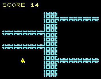 Colonists want to colonize a planet and have built silos with grain. However, dangerous monsters want to to get at the grain and are constantly attacking the silos. You have been assigned to protect one of these silos, and must prevent the monsters from doing so by attacking them with a small one-man interceptor. With a keystroke you launch, and with another, a bomb is dropped. With each hit, you get one point credited. If a monster has reached the grain, the game ends.